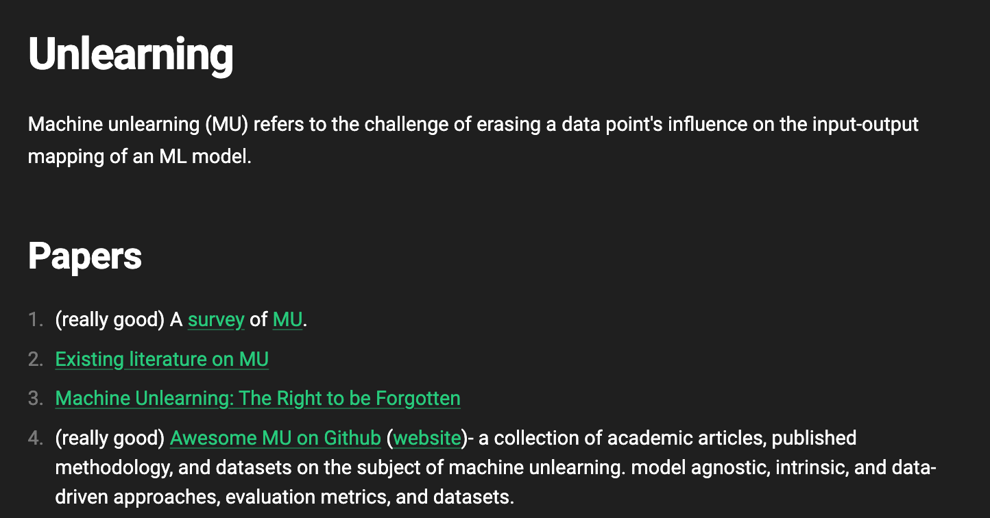 I've added a new section to the ML-Compendium focusing on Machine Unlearning, which delves into methods for models to forget information. This section comprises articles, code snippets, datasets, and more.