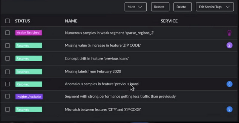 4. DeepChecks.com, A fresh startup that has risen out of stealth mode. Their website talks about supervising and controlling the health, performance, and stability of our models. Promising an end-to-end approach towards monitoring machine learning pipelines. Tracking raw-data, checking for concept-drifts, and integrity issues. A mysterious feature that promises to analyze preprocessing code for the purpose of visibility of data transformations, with additional analysis tools in order to find limitations and weak segments. In Figure 10b, we can see that a future version of their system will report alerts such as weak segments, strong segments, segments with decreased traffic and I assume increased traffic as well, missing values, concept drifts, missing labels, anomalous samples, traffic and feature mismatch which seems like negative correlations between features.