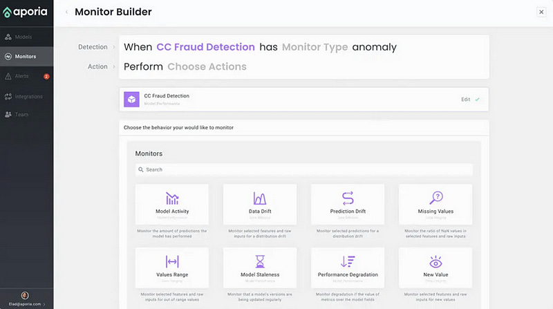 10. Aporia.com — Allows a data scientist to quickly configure advanced production monitors. Their focus on a strong UX and ease of use, as seen in Figure 12b, shows how fast you can get moving with various use-cases such as detecting drifts, monitoring data integrity issues, performance, etc.