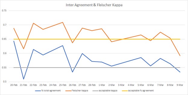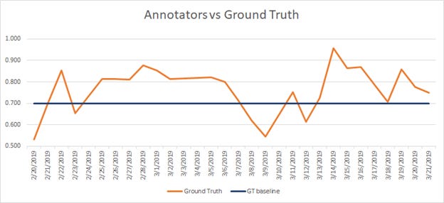 Monitoring metrics such as inter-rater agreement, self-consistency, ground-truth agreement are essential (Figures 1 & 2) because without them you don’t know the quality of your annotation.