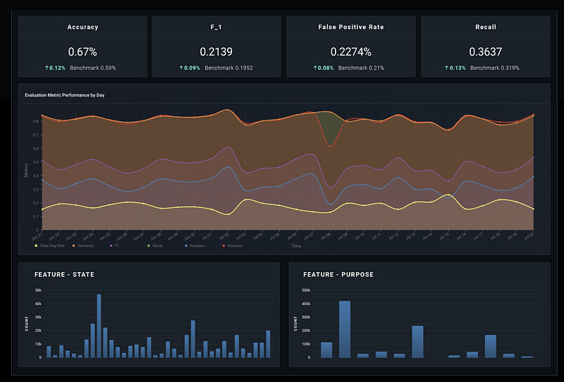 Metrics such as precision, recall, F1 and PRAUC describe our success or failure, therefore we are highly motivated to monitor them in real-time, as seen in Figure 6. For unsupervised algorithms, such as clusters, we can monitor metrics like cluster-homogeneity, etc. Monitoring model performance helps us understand when things start to misbehave or when there are changes upstream.